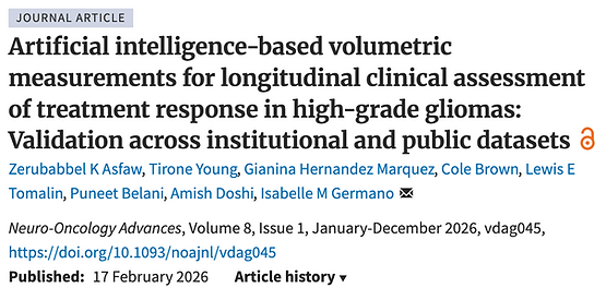 Artificial intelligence-based volumetric measurements for longitudinal clinical assessment of treatment response in high-grade gliomas: Validation across institutional and public datasets